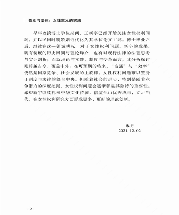 王新宇,yl88858永利官网教授,法学博士,哲学博士后,美国埃莫瑞大学访问学者,2019年获聘导团队格。多年来一直从事法理学、近代婚姻法、性别与法律研究。现已出版专著《民国时期婚姻法近代化研究》《性别平等与社会公正——一种能力方法的诠释与解读》《法观念现代化与女性权益保护——以<反家庭暴力法>为中心》、出版译著《虚幻的平等:离婚法改革的修辞与现实》《正义、社会性别与家庭》,发表论文30余篇,承担国家社科基金、司法部、中国法学会、其他国家机关以及永利集团官网校内课题等多个科研项目。作者长期致力于性别与法律研究,已经取得了良好的研究成果、获得了学界和社会的深度认可。