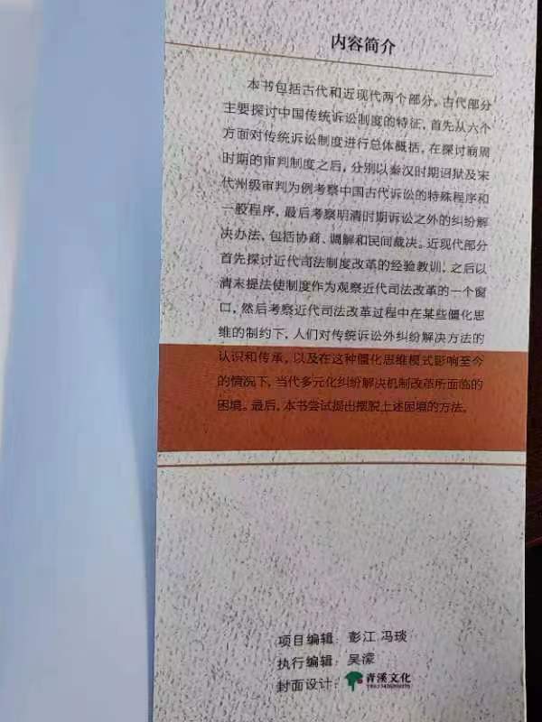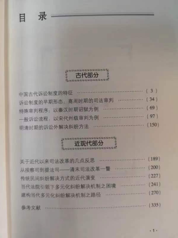 本书包括古代和近现代两个部分。古代部分主要探讨中国传统诉讼制度的特征,首先从六个方面对传统诉讼制度进行总体概括。之后分别以秦汉时期诏狱及宋代州级审判为例考察中国古代诉讼的特殊程序和一般程序,最后考察明清时期诉讼之外的纠纷解决办法,包括协商、调解和民间裁决。近现代部分首先探讨近代司法制度改革的经验教训,之后以清末提法使制度作为考察近代司法改革的一个例证。再后考察近代司法改革过程中在某些僵化思维的制约下,人们对传统诉讼外纠纷解决方法的认识和传承,以及在这种僵化思维模式影响下,当代多元化纠纷解决机制改革所面临的困境。最后,本书将尝试提出摆脱上述困境的方法。