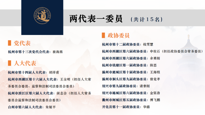 金道总分所共有15位两代表一委员,32位民主党派人士。2023年首席合伙人胡祥甫被聘任为浙江省人大常委会咨询专家;首席合伙人胡祥甫、主任王全明、副主任崔海燕入选杭州市法治人才库。2022年首席合伙人胡祥甫、兼职律师封利强被聘任为首批浙江省法学会首席法律咨询专家;主任王全明、兼职律师陈党及袁继红被聘任为杭州市法学会首席法律咨询专家;高级合伙人胡东迁被聘任为西湖区法学会首席法律咨询专家。