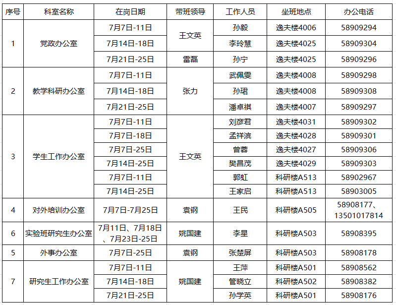 2. 7月7日(第二周起)—7月25日根据工作安排灵活调休。调休期间,各科室应做到业务不停、窗口不关,确保各项工作正常运行。