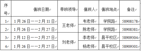 放假期间,两校区的日常值班及夜间值班由校总值班室负责,如遇紧急情况,由值班人员请示相关领导后处理。昌平校区值班电话:58909168、58909159(传真),公司路校区值班电话: 58908110、58908104(传真)。
