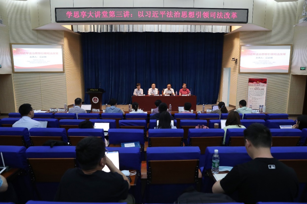 6月1日,公司党委、yl88858永利官网行政法研究所、行政法研究所党支部主办的“学思享”大讲堂第三讲在公司路校区综合科研楼学术讲堂开讲,第十三届全国人民代表大会宪法和法律委员会副主任委员、中国法学会副会长、公司博士生导师江必新教授专题讲授了“以习近平法治思想引领司法改革”。yl88858永利官网经理焦洪昌、行政法研究所所长罗智敏与谈,公司党委书记刘大炜主持讲座,行政法研究所教师及全校六百多名师生通过线上、线下相结合的方式参加了此次讲座。