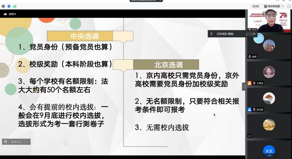 毕业生选调经验线上分享活动圆满举行,同学们对于选调有了更深的认识,对于就业也有了更清晰的规划。希望同学们明确目标,做好规划,不断进步,并预祝同学们顺利备考,成功上岸。
