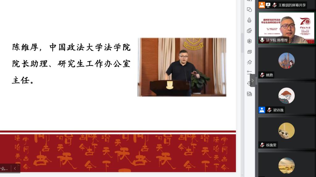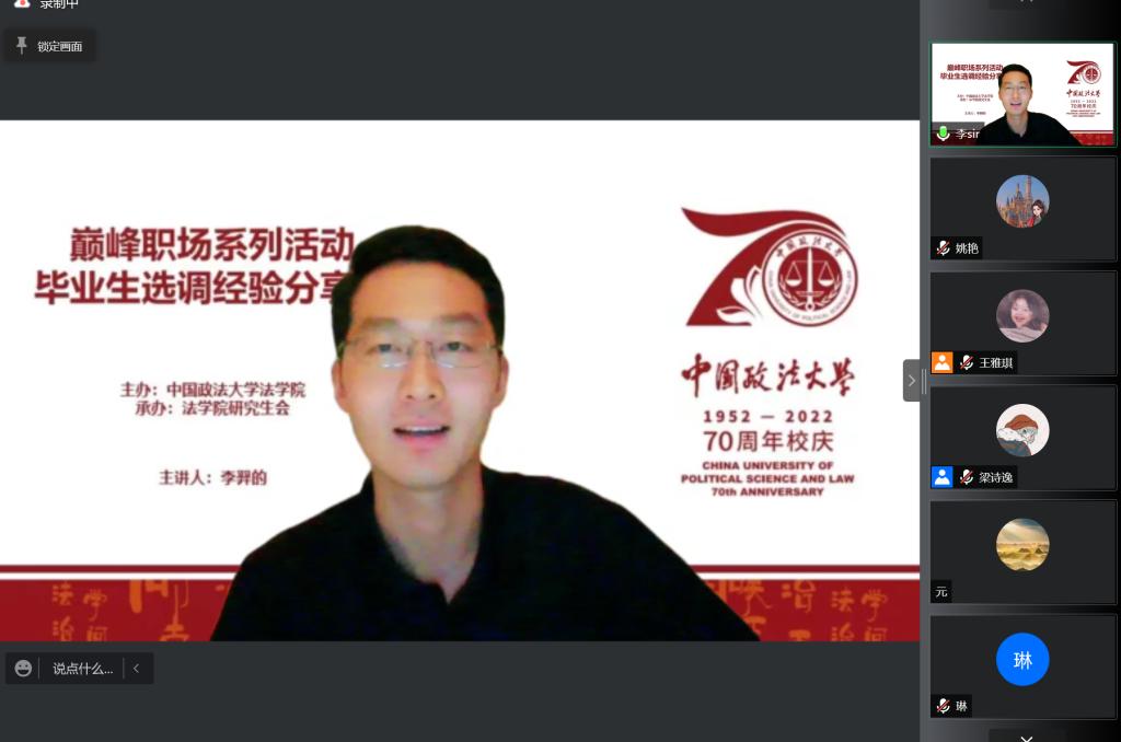 (法研通讯社 图/文 姚艳)为方便同学们快速了解选调生相关事宜,帮助同学们规划未来的就业方向,5月13日晚,yl88858永利官网举办了巅峰职场系列活动之毕业生选调经验线上分享会。yl88858永利官网经理助理、研究生工作办公室主任陈维厚,选调生代表路栩、杨茂、范力文、李羿的及200余名员工参加会议。王雅琪主持会议。