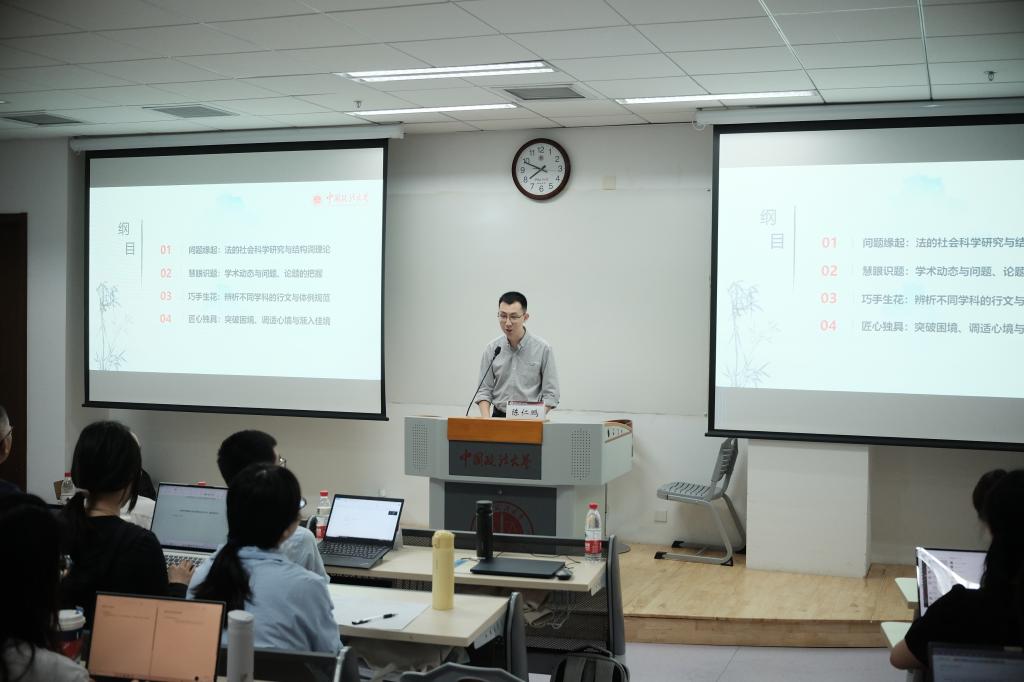 陈仁鹏围绕“社科法学视域下的法史研究与论文写作”为主题进行分享。首先,他以何为“社科法学”作为引入,将社科法学研究的视野、理路与方法进行大致的勾勒,希望同学们以问题为导向,尝试多样化的研究进路。其次,他建议同学们积极研读经典、与经典对话;以国家社会科学基金、中国法学会的课题为导向把握员工动态,从而进行论题选取,为后续写作奠定良好的基础。最后,他希望大家多读书、多沉淀,以平和的心态去面对研究生的生活与学术论文写作。