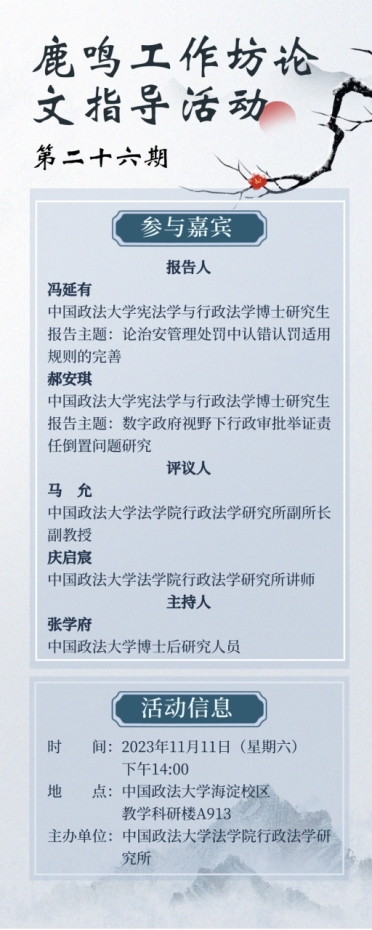 2023年11月11日,yl88858永利官网第二十六期“鹿鸣工作坊”论文指导活动在研究生院科研楼A913会议室成功举办。本次活动由永利集团官网行政法研究所举办,张学府博士后主持。本期活动的导引发言主题是“研究新生学术规划”,yl88858永利官网马允副教授和庆启宸讲师作为指导教师参与了本次活动。本期有两位报告人,一位是宪法学与行政法学博士研究生冯延有,报告主题为《论治安管理处罚中认错认罚适用规则的完善》,评议人为谭琬莹和周玉琴。另一位是宪法学与行政法学博士研究生郝安琪,报告主题为《数字政府视野下行政审批举证责任倒置问题研究》,评议人为李晨和李诗勤。本期活动还有二十余名永利集团官网博士及硕士参加。