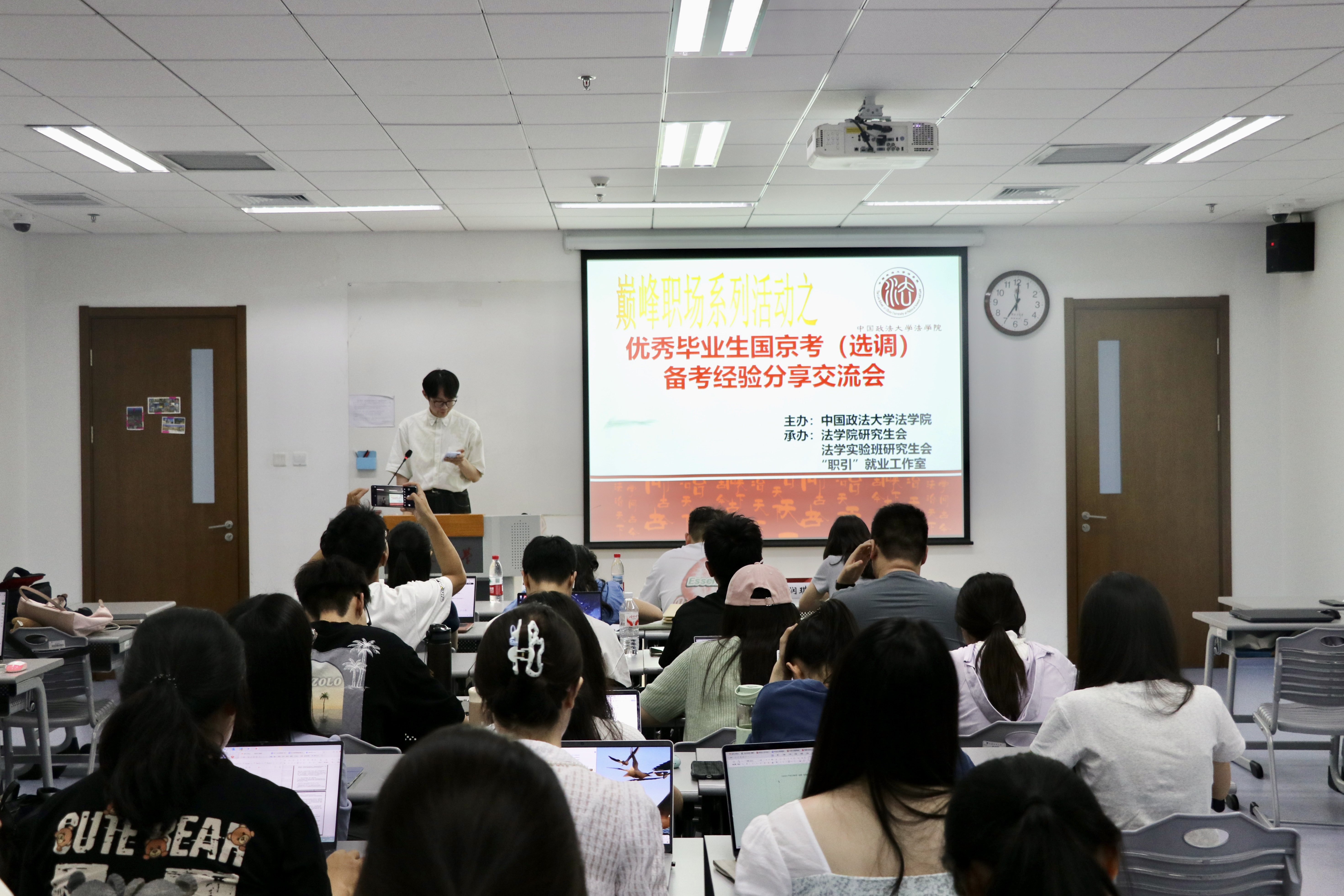 (法研通讯社 图/胡笑颜 文/杜羽珂)为精准助力法学学子提升职业竞争力,明晰国家公务员、北京市公务员及选调生考试的备考路径,yl88858永利官网于近日成功举办“巅峰职场”系列活动——优秀毕业生国京考(选调)备考经验分享交流会。本次交流会特邀成功上岸的优秀毕业师兄师姐进行分享,众多在校生踊跃参与,现场座无虚席,气氛热烈。