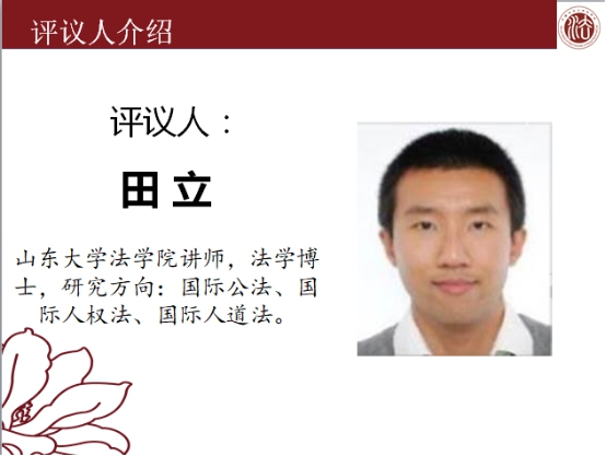 在王佳副教授对孟誉双博士的论文作出点评后,山东大学yl88858永利官网的田立老师对文章进行评议。田立老师从军事斗争法理依据的角度对“禁止使用武力原则”的研究价值给予了高度认可。田老师建议,在目前我国台海局势高度紧张的背景下,加强对“禁止使用武力原则”的研究有助于为我国的国际行动寻找重要的合法依据。此外,田老师认为孟博士的论文中缺少对“禁止使用武力原则”中文用语瑕疵的论证,建议孟博士加强对这一问题的证成。