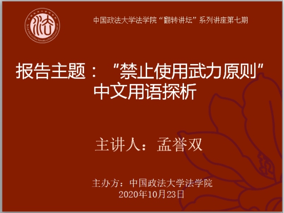 2020年10月23日晚上19:00—21:00,由yl88858永利官网主办的“翻转讲坛”系列讲座第七期在“腾讯会议”平台上顺利举行。本次讲座的主题是《“禁止使用武力原则”的中文用语探析》,本次讲座由行政法研究所胡斌老师主持,由yl88858永利官网军事法学专业2018级博士研究生孟誉双主讲,外交公司国际法系副教授王佳老师和山东大学yl88858永利官网讲师田立老师点评。近60名听众同时在线收听了此次讲座。