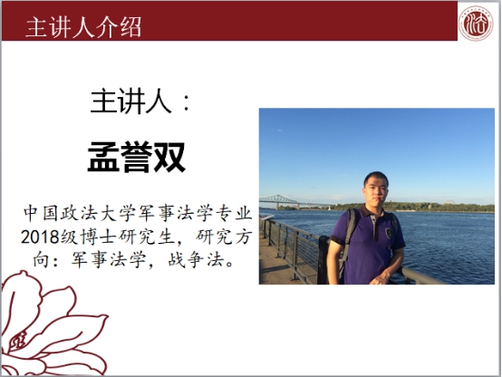 紧接着,由孟誉双博士向广大听众作《“禁止使用武力原则”的中文用语探析》主题报告。本次报告共包含三部分。