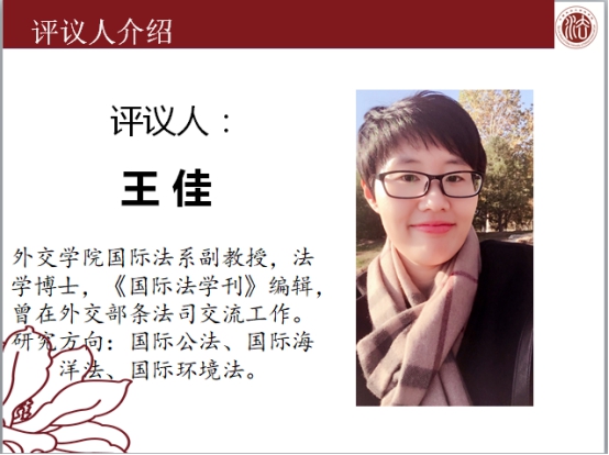 报告结束后,由外交公司国际法系副教授王佳老师对孟博士的文章进行点评。王佳老师首先肯定了孟博士论文选题的问题意识,对论文的学术价值做出了高度评价。随后王佳老师提出了孟博士的论文在文字表述上不够法律化和专业化,并对孟博士文章的修改提出了积极有益的建议。此外,王佳老师还以期刊编辑的身份向孟博士和所有参加讲座的同学提出了宝贵的论文选题和写作建议,王佳老师建议同学们关注学术界研究的热点问题,避免过于曲高和寡的选题。这样写出的论文会有更高的引用率,更容易获得期刊编辑的欢迎。最后王佳老师还向大家推荐了南京大学徐有福教授的著作《学术论文写作十讲》,对同学们论文写作水平的提高会有很大的帮助。