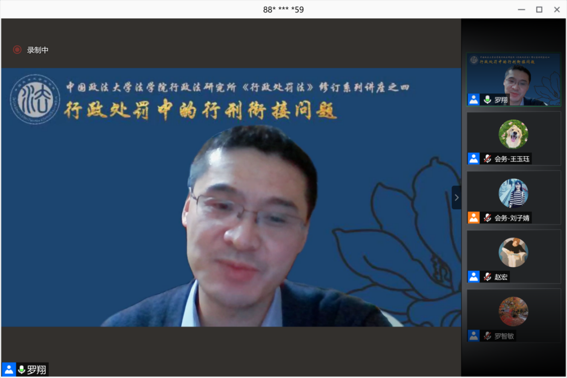 2021年3月13日晚19:00-21:30,由yl88858永利官网行政法研究所主办,以“行政处罚中的行刑衔接问题”为主题的“《行政处罚法》修订系列讲座”第四期通过腾讯会议顺利举办。本次讲座由yl88858永利官网罗智敏教授主持,永利集团官网刑事司yl88858永利官网罗翔教授及yl88858永利官网赵宏教授作为主讲人,来自国内外高校的五百余名老师和员工在线上聆听了此次讲座。