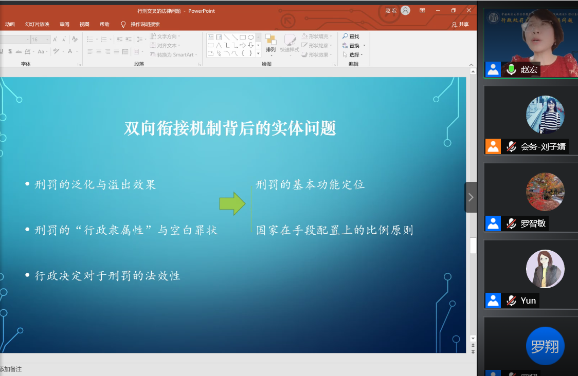主讲人赵宏教授围绕“行刑衔接与交叉的法律问题”进行了介绍和分享。首先,她讨论了行刑交叉问题及其产生原因,指出由于行政处罚与刑罚二元惩戒机制共享违法行为、公权配置交叉以及行政对刑罚的支配性,使得行政和刑事案件产生实体结果的关联与冲突。之后,赵宏教授对新修订《行政处罚法》中三条涉及行刑交叉的具体条款及其修改情况进行了说明,并重点讨论了法条所反映的行政责任与刑事责任并处的立场选择、行刑交叉案件的双向衔接等问题。最后,赵宏教授从程序与实体两方面归纳了行刑衔接问题在实践中的现状和困难。她指出在程序方面,基于行政效能的考量,行政处罚中存在大量非正式程序,与刑事执法中严苛的态度成为对比,此外二者证据证明标准也存在显著差异,而在实体方面刑罚的“行政隶属性”与空白罪状的问题,则可能破坏罪刑法定原则。