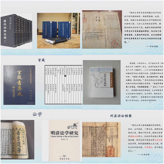 就明清法律社会史的材料,汪雄涛老师作出了如下分类,首先是契约,契约是典型的法律社会史素材,近年来大量出版,问题则是如何从从日益丰富的史料中推进基本理论和创新;其次是判牍和案例,杨一凡教授近年来进行了大量史料的整理,然而问题是学界的利用并不太多,并且利用的程度小于整理的程度;接下来是诉讼档案,分为中央司法档案和州县诉讼档案;第四是笔记史料,存在的问题是利用比较薄弱,高质量的笔记史料不多;代表著是《道咸宦海见闻录》;第五种则是刑名指南,例如各类官箴书;讼学文献相对而言不多,比较零散,收集比较困难。