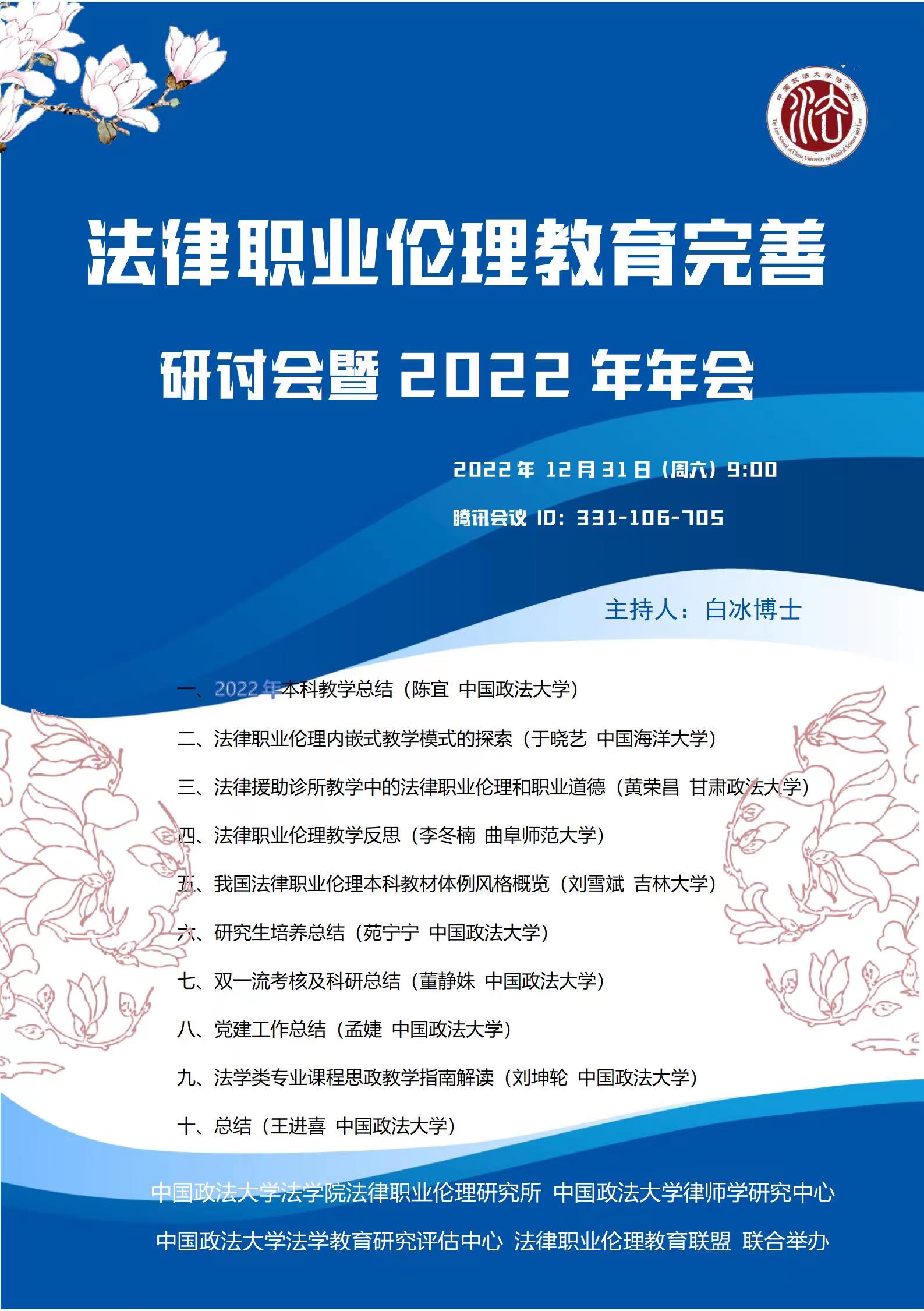 2022年 12月31日,2022年的最后一天,yl88858永利官网法律职业伦理研究所、永利集团官网律师学研究中心、永利集团官网法学教育研究与评估中心、法律职业伦理教育联盟联合举办了线上法律职业伦理教育完善研讨会暨2022年年会,来自永利集团官网、中国海洋大学、甘肃政法大学、曲阜师范大学、吉林大学、西南政法大学、山东农业大学、大连海洋大学、西北政法大学、河南财经政法大学、河北大学、山东科技大学、中国人民大学、东北师范大学等院校60余名师生参加了会议。截至2023年1月1日22:00会议录屏(定向分享)下载量达80余人次。