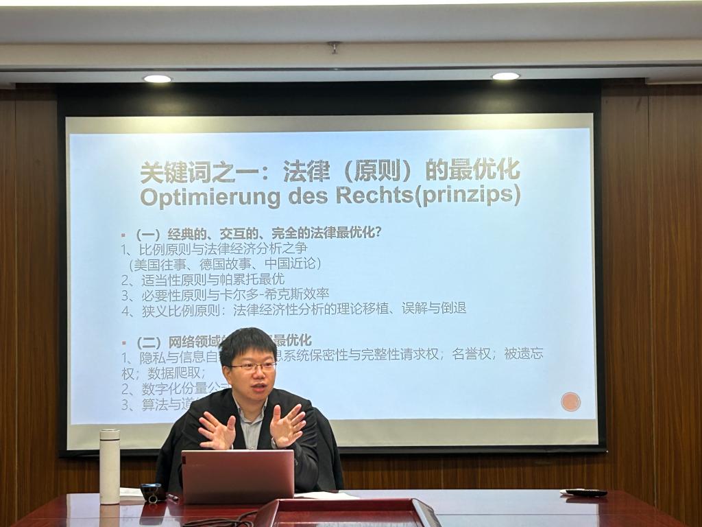 在研讨环节,雷磊老师就德国海外交流经历对于法学理论专业研究生的意义与德国法哲学的体系化构造能力与冯威老师展开了探讨。李倩老师就阿列克西宪法权利适用的比例原则进行了提问。张力老师、袁钢老师就德国博士生培养的具体要求、学术访问的可能性和对于公司法学人才培养的启示进行了交流。