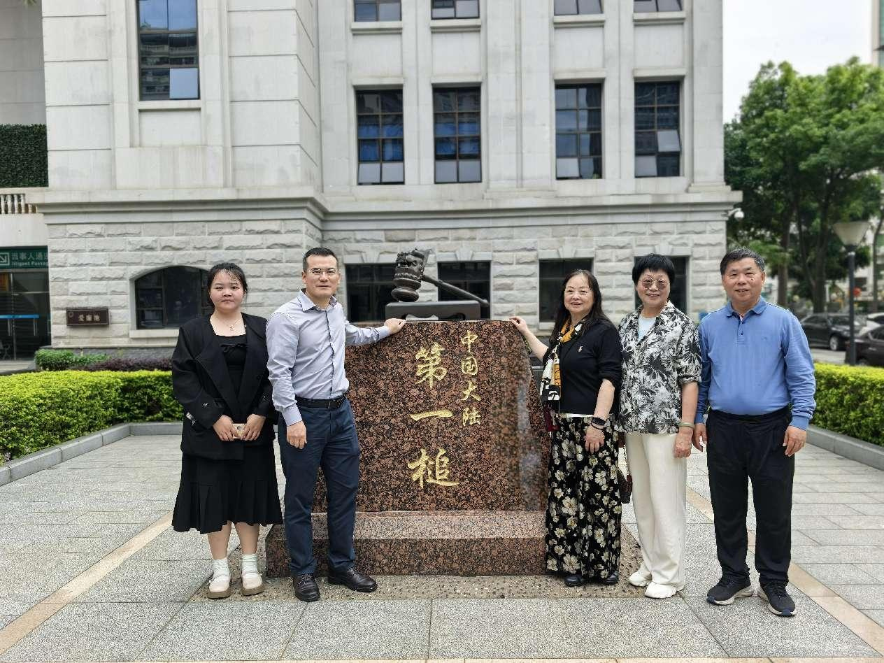 抵达思明区法院后,团队成员首先参观了具有特殊历史意义的 “中国大陆第一槌”,并一齐合影留念。2001年9月14日,思明区法院时任经理在审理刑事案件时敲响此槌。它由花梨木雕刻獬豸兽头,手柄有麦穗和齿轮雕饰。思明区法院敲响的“第一槌”,很快引起了最高人民法院的注意。2002年法槌在全国法院统一使用,“第一槌” 现藏于中国法院博物馆,它是我国审判形式改革的标志性见证,彰显着司法工作对公正与效率的追求。