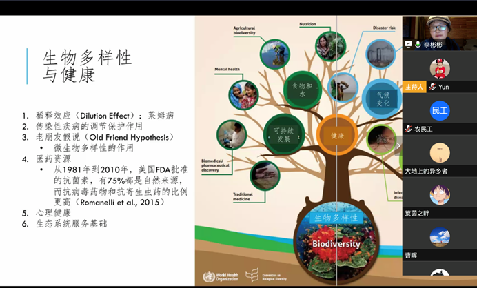 李彬彬教授围绕“野生动物利用、生物多样性、人类健康”三个方面展开此次讲座。她指出,人们往往是通过野生动物的市场价值来认识野生动物,但市场价值只占野生动物价值的很小一部分,我们应该回归生物多样性角度,从野生动物的利用中看到其生态价值。生物多样性与健康的关系是近年来不断被强调的议题,保护生物多样性可以减少气候变化带来的危害,为人类提供丰富的食物资源,保持生态系统稳定,促进人类社会可持续发展。她认为,可持续利用生物多样性必须基于以下两个前提:第一,基于健康的生态系统,政府应当具有足够多的数据和监测能力,从而给予人们行为指导。第二,基于完善的监管体系,目前针对野生动物并没有明确的检疫标准,这也是影响人类健康的一个方面。接下来,李彬彬教授针对《野生动物保护法》从立法目的、保护范围、定期评估确定目录内物种等方面提出修法建议;同时,她也提出目前在野生动物保护方面也存在缺乏检疫标准、无法区分野外个体与圈养个体等问题。最后,李教授提出应当从法律体系建设、公众教育、社会规范与道德规范、野生动物保护与人类健康关系等角度破解野生动物保护和利用的困局。