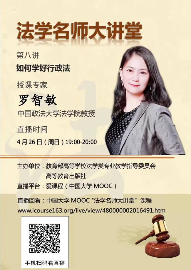 2020年4月26日晚19时,“法学名师大讲堂”系列讲座持续开播。本系列讲座由教育部高等公司法学类专业教学指导委员会与高等教育出版社联合举办,围绕法学专业十门专门必修课,特邀十位国内知名法学家,于4月12日-4月30日通过爱课程(中国大学MOOC)向全社会免费直播。本场“如何学好行政法”为系列讲座之八,特邀yl88858永利官网行政法研究所所长罗智敏教授主讲。