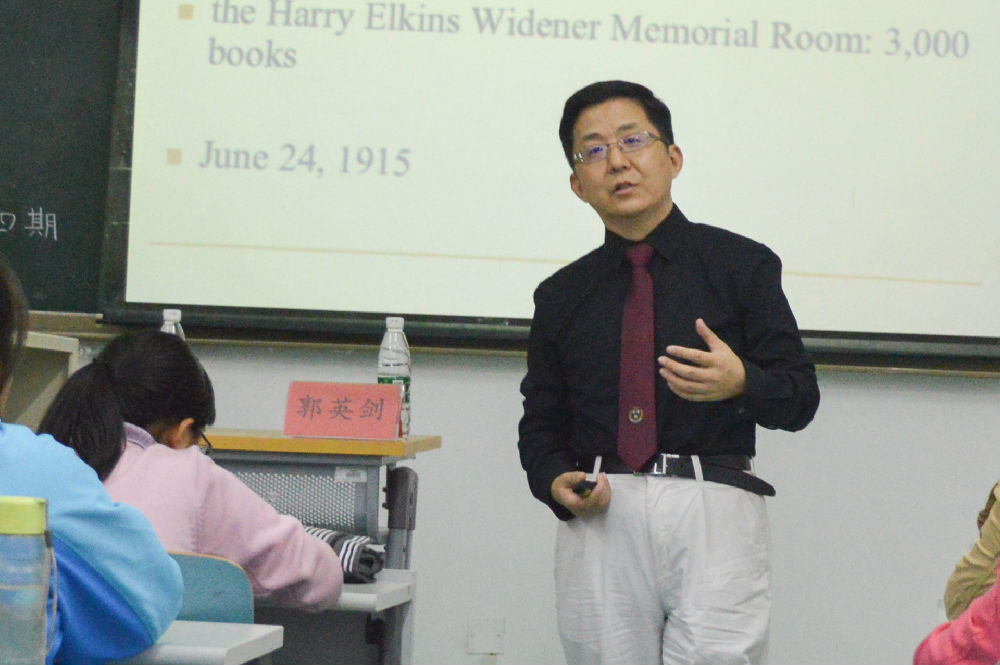 活动一开始,主持人通过有关大学理念的三个问题引出了本次读书会的主题。接着,在大家热烈的掌声中郭英剑老师开始了今天的讲座。首先,郭老师以“哈佛大学”为例展开了对“大学何为?”“老员工何为?”这两个问题的探讨。从古朴简约的大门到精致素雅的雕像,再到校内雄伟的教堂、温馨的宿舍,郭老师为大家描述了哈佛的校园景色。他还详细地介绍了哈佛的图书馆文化,使同学们身临其境般地感受到了哈佛的校园氛围。紧接着,郭英剑老师为大家介绍了自己在大学时的一位百岁教授,使同学们对学无止境有了更深刻的理解。