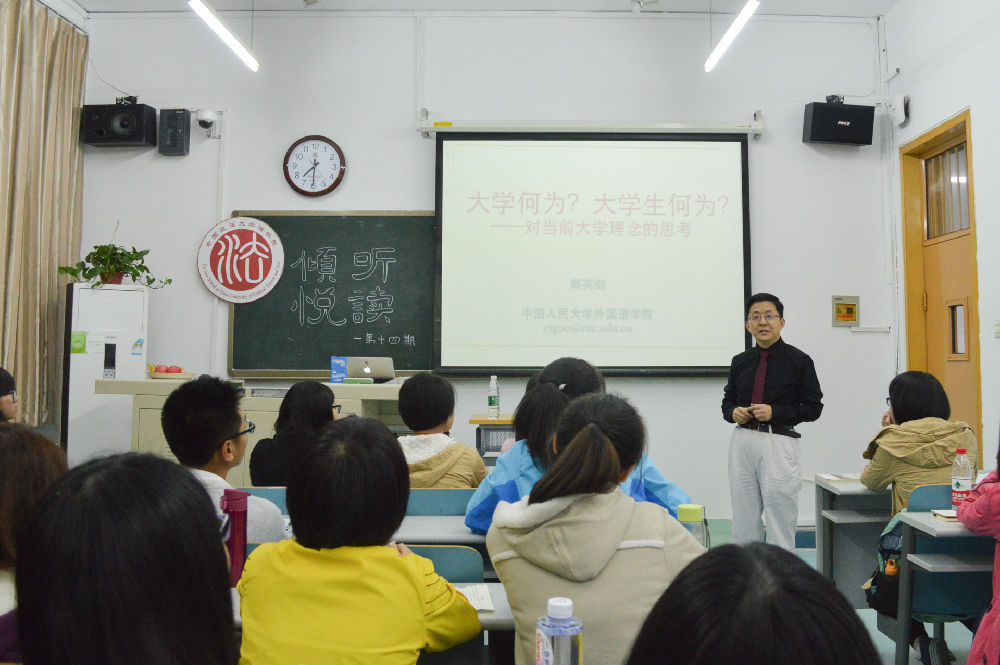 2015年10月21号晚7时,倾听悦读第十四期在永利集团官网昌平校区端升楼416教室成功举办,本次读书会以“大学何为?老员工何为?”为主题。出席本次读书会的嘉宾是中国人民大学外国语公司教授、博士生导师郭英剑老师。