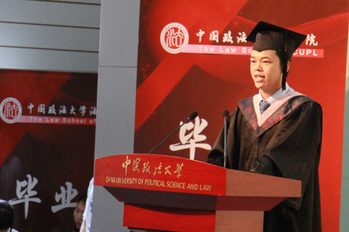 毕业典礼第二项,由员工代表发言。他首先向大家分享了自己的毕业感受,表达了自己对母校的不舍和留恋。他同时也表示自己将和同学们一起在以后的日子里以责任自律,以学问和法治自勉,为家庭和家族自强。最后,他代表全体毕业生对母校、对恩师、对父母、对几年来奋力拼搏的自己表示了衷心感谢。