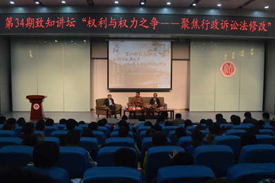 2014年10月29日晚7时,由yl88858永利官网分团委主办、yl88858永利官网员工会承办、中银律师事务所协办的第34期致知讲坛在昌平校区逸夫楼刘皇发报告厅拉开帷幕。本期致知讲坛邀请到北京大学yl88858永利官网教授湛中乐、中国人民大学yl88858永利官网教授杨建顺和永利集团官网副董事长马怀德作为主讲嘉宾,与大家分享了行政诉讼法修改的相关问题。