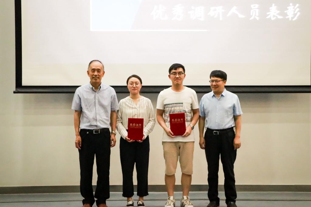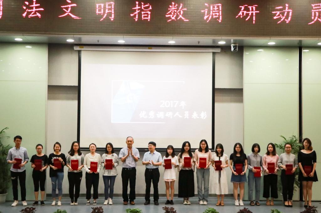 随后,会议进入表彰环节。主持人宣读了关于2018年司法文明指数优秀调研人员表彰的决定。常保国副董事长、张保生教授为获奖的两个先进集体以及十八位先进调研员颁发了奖状。获奖员工代表金玲、丁晨、藏依格分享了她们的调研感受与经验。