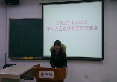首先党支部书记张馥结合体改班的情况,就党的十八大报告关于法治的内容分享了学习心得。他说,党的十八大全面总结了我国的法治建设,提出全面推进依法治国,要推进科学立法、严格执法、公正司法、全民守法,坚持法律面前人人平等,保证有法必依、执法必严、违法必究的法治理念。作为将要踏入政法系统的在校老员工,每个人都要做到学法、懂法、知法、用法,在以后的工作中践行法治精神。