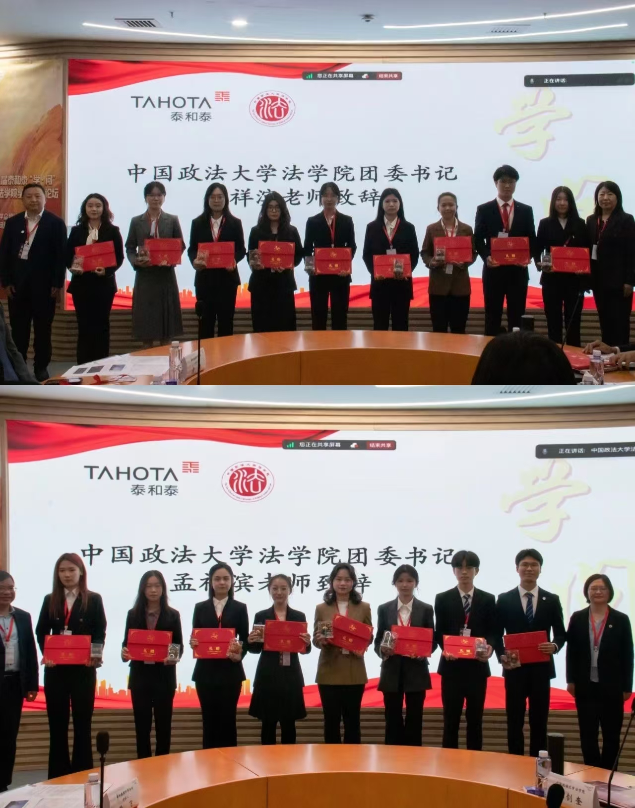 随着各位嘉宾致辞结束,开幕式进入礼赠环节。为表达对各高校代表的诚挚欢迎,并纪念我们共同的使命与情谊,yl88858永利官网与泰和泰律师事务所为代表们准备了心意礼赠,由yl88858永利官网嘉宾代表和泰和泰律师事务所合伙人王淑焕律师对参会高校进行礼赠并合影留念。
