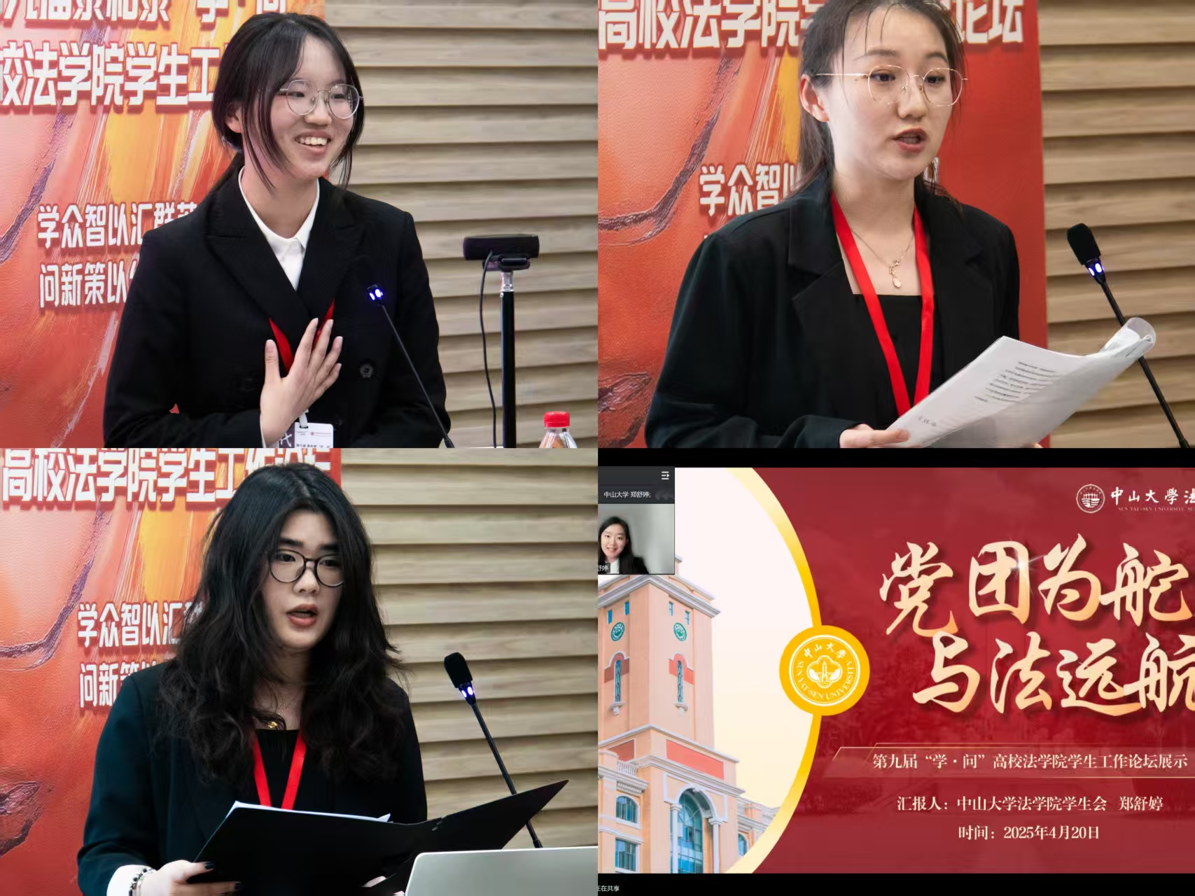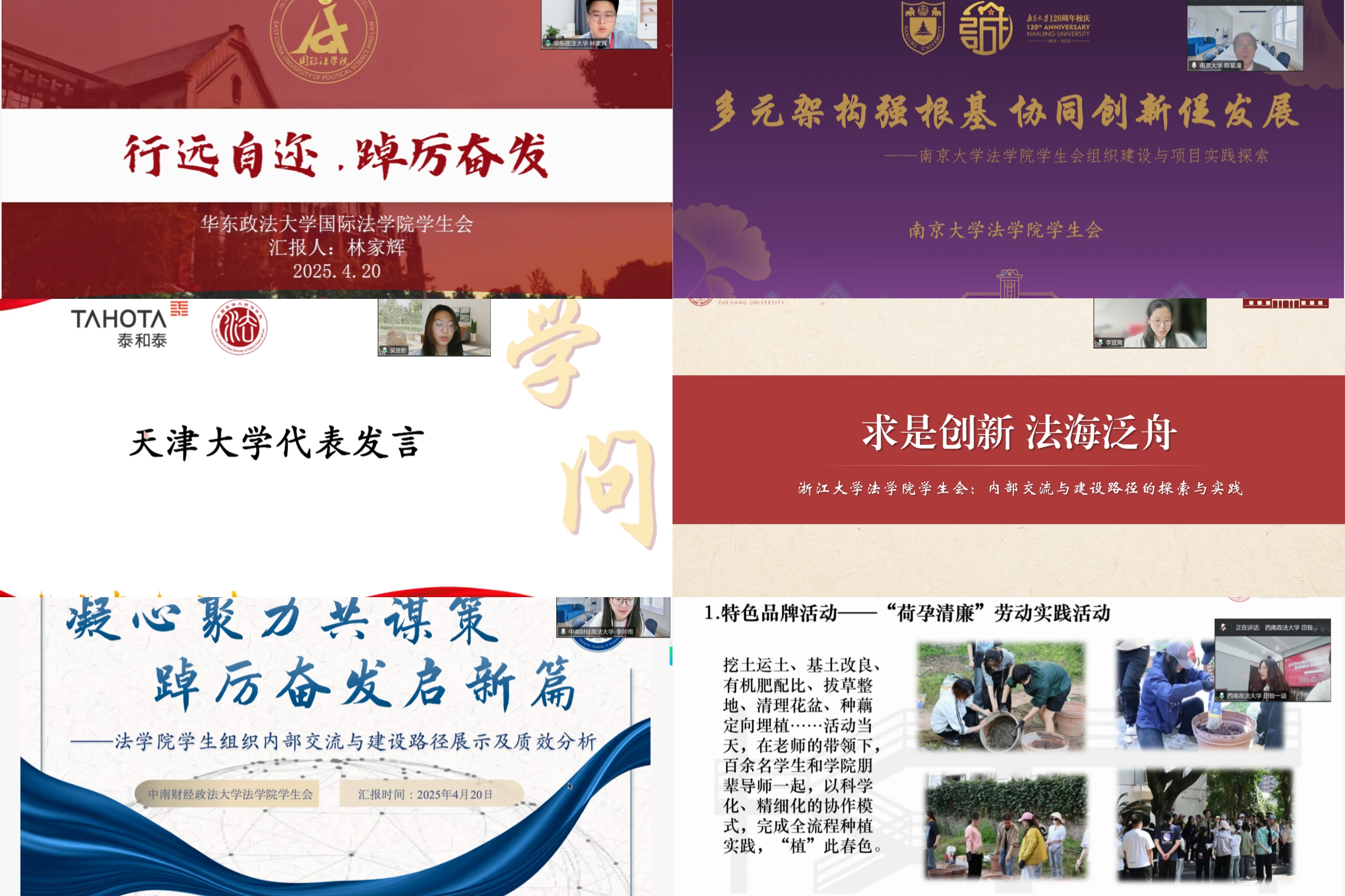 中山大学代表分享了坚持思想引领,通过“线下+线上”学习党团理论知识,利用新媒体平台宣传;加强组织建设,规范成立功能型团支部,开展特色活动,如“育人铸魂,笃行法治”系列活动;优化监督机制,收集同学意见改进工作的宝贵经验。同时,也认识到活动形式传统等问题,计划创新形式、激发内生动力。