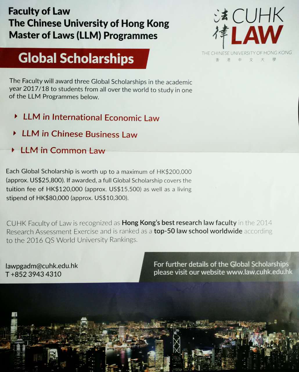 香港中文大学2017/18学年法学硕士项目(LLM)提供3个国际奖学金名额,每个名额最高可获得20万港币的奖学金资助,其中包括12万港币的学费以及8万港币的生活补助。欢迎感兴趣的同学登陆官网www.law.cuhk.edu.hk了解奖学金申请详情。