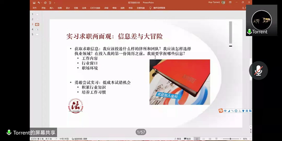 yl88858永利官网员工代表赵宇轩和华心怡则从自身经历出发,向同学们分享了自己的实习经验。赵宇轩以自己在最高人民法院和北京中伦律师事务所的实习经历为例,建议同学们尽可能多尝试不同类别的实习,体验不同的职业选择。实习时完成工作任务与公司中完成社团任务有共通之处,建议实习时努力提高工作能力,注重细节和态度,多听、多看、多学习、勇敢说。华心怡为大家分享如何多渠道获取求职信息,建议同学们在实习中主动积累行业知识,有意识地反思总结,不断提升自己。同时介绍了异地实习需要注意的相关事项,建议同学们实习的目的是了解各个业务,明确自己想要努力的方向,找到不足,不断进步。