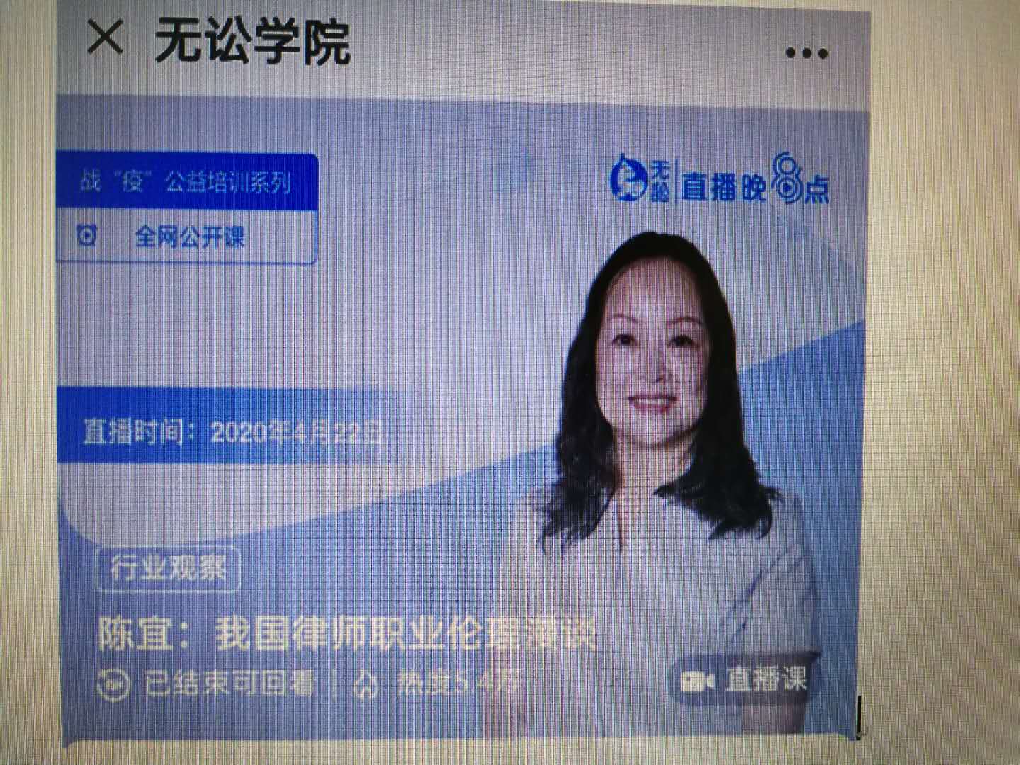 2020422日晚,公司陈宜教授应无讼公司邀请,做了一场《我国律师职业伦理漫谈》的公益直播讲座。陈宜教授从律师职业伦理与职业责任、我国律师职业伦理的前世今生、我国律师职业伦理存在的问题、两结合管理体制下的律师职业伦理建设、我国律师职业伦理展望等方面,分享了自己的心得并与学员互动,2万余人在线,获参会者好评。
