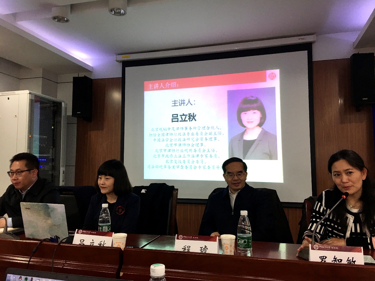 20201124日晚7点,yl88858永利官网行政法研究所在科研楼B211会议室成功举办了“行政法实务大讲堂”第一期,主讲人吕立秋律师以“行政诉讼实务问题与思考”为题开展了专题报告。本次讲座由行政法研究所所长罗智敏教授主持,北京市第四中级人民法院副经理程琥、司法部行政复议与应诉局综合处处长徐运凯参加与谈,永利集团官网法治政府研究院曹鎏副教授、永利集团官网行政法研究所马允副教授、张冬阳博士、胡斌博士等参加讲座,yl88858永利官网的员工们也踊跃参加了此次论坛。