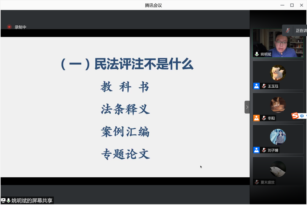 姚明斌副教授以“民法评注本土化”为题,从规范、学说和审判实践三个层面分析了民法评注的使命,指出民法评注具有促进后法典时代多元法源发展、促使学说通说形成和加快裁判实践系统整合等功能。姚明斌副教授总结了民法法律评注的写作要点,指出了评注面向实务人士和法科员工等阅读人群,应使用通俗的概念术语,文风当兼顾精准与通俗。最后,他提出法律评注要兼顾案例运用、规范适用、实务学理和本土问题,运用整理型、支撑型、批判型、问题型等多种法律评注形态促进民法评注的本土化发展。