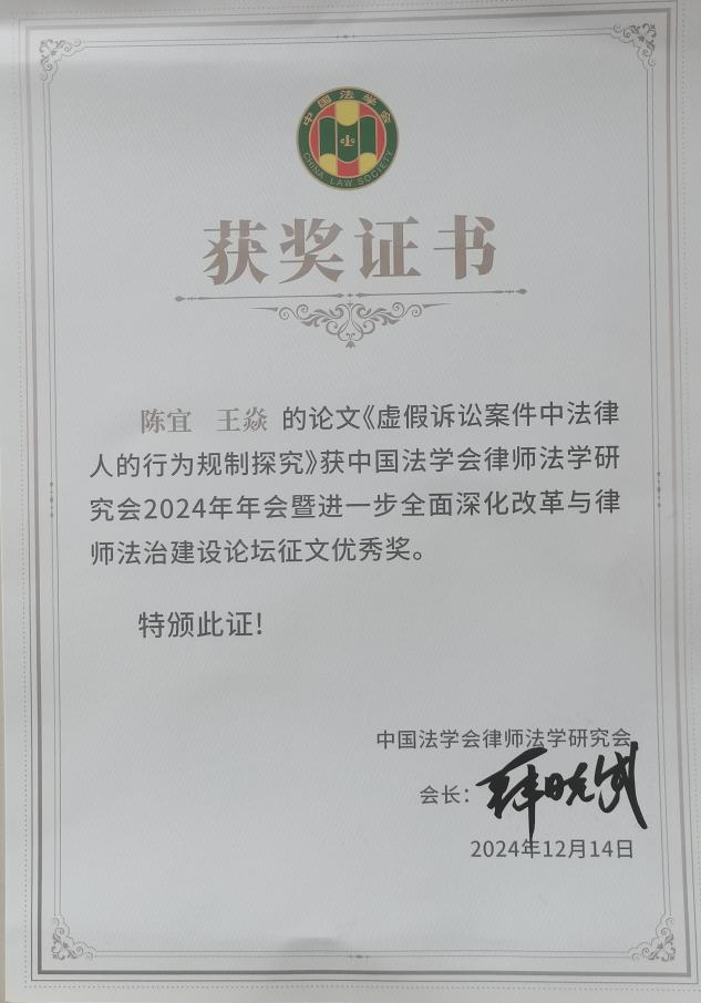 陈宜教授与硕士研究生王焱参会并提交了论文《虚假诉讼案件中法律人的行为规制探究》。深入研究虚假诉讼这一法律实践中的热点和难点问题,通过细致的案例分析对虚假诉讼案件中涉及的法律人行为规制提出了独到且具有建设性的观点,论文获得了中国法学会律师法学研究会2024年年会暨进一步全面深化改革与律师法治建设论坛征文优秀奖。