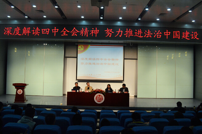 党的十八届四中全会以依法治国为主题,吹响了建设社会主义法治国家的号角,为动员全院师生深入学习贯彻宣传全会精神,深刻领会全面推进执法治国的重大意义、根本要求、正确方向和重大任务,坚定不移走社会主义法治道路,2014年10月28日下午,yl88858永利官网分党委在昌平校区逸夫楼刘皇发报告厅举行了以“深度解读四中全会精神,努力推进法治中国建设”为主题的专题报告会。yl88858永利官网经理薛刚凌、副经理焦洪昌、法理学研究所蒋立山教授作为主报告人,分别从宪法学、法理学和行政法学角度解读十八届四中全会关于全面推进依法治国的重点内容。青年教师袁钢担任报告会主持人。公司领导班子、各教研室教师、全体本科生党员与入党积极分子参加本次报告会。