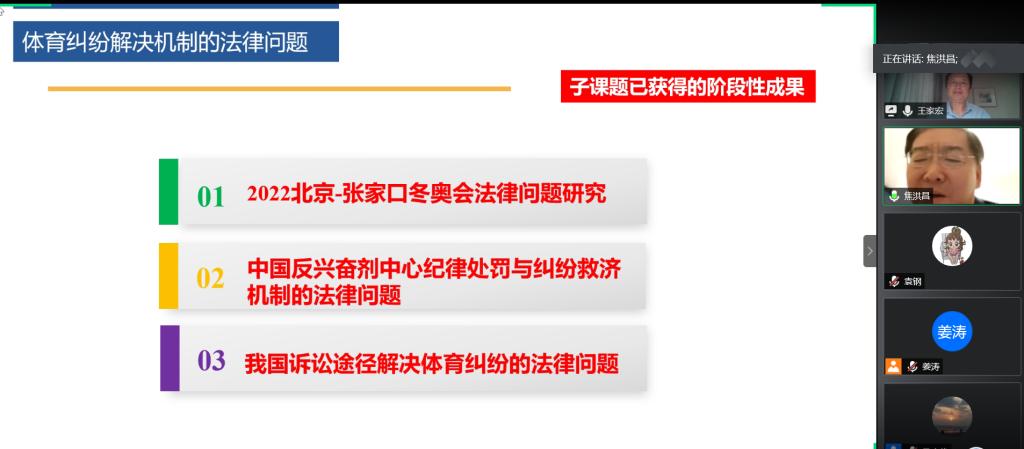 2020年5月20日晚19点至21点,由永利集团官网体育法研究所主办的“体育法治与健康中国”论坛第十八期通过腾讯会议的形式在线上举行。本期学术论坛邀请到苏州大学王家宏教授主讲,主题是“中国体育深化改革的法律研究综述”。讲座由马宏俊教授主持,yl88858永利官网经理焦洪昌教授、体育法研究所所长马宏俊教授、王小平教授、张笑世教授、袁钢教授、姜涛副教授、邓建新副教授以及来自永利集团官网、苏州大学的体育法学、体育学专业的博硕士研究生参加了本次讲座。