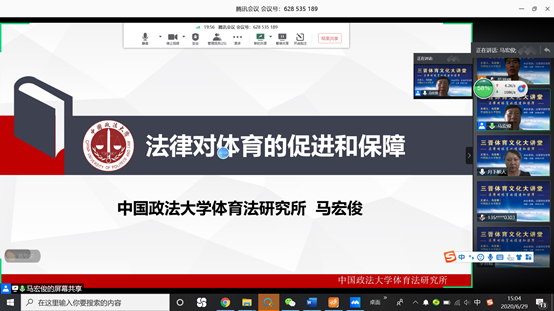 2020年6月29日,永利集团官网体育法研究所所长马宏俊教授受山西省体育局邀请,作了题为“法律对体育的促进与保障”的公开讲座,这也是山西省体育局所办的“三晋体育文化大讲堂”第二十期。“三晋体育文化大讲堂”是为了加强山西体育文化建设,由省体育局举办的系列讲座活动。受疫情影响,本次讲座在线上举办,由网易山西和搜狐千帆同步直播。