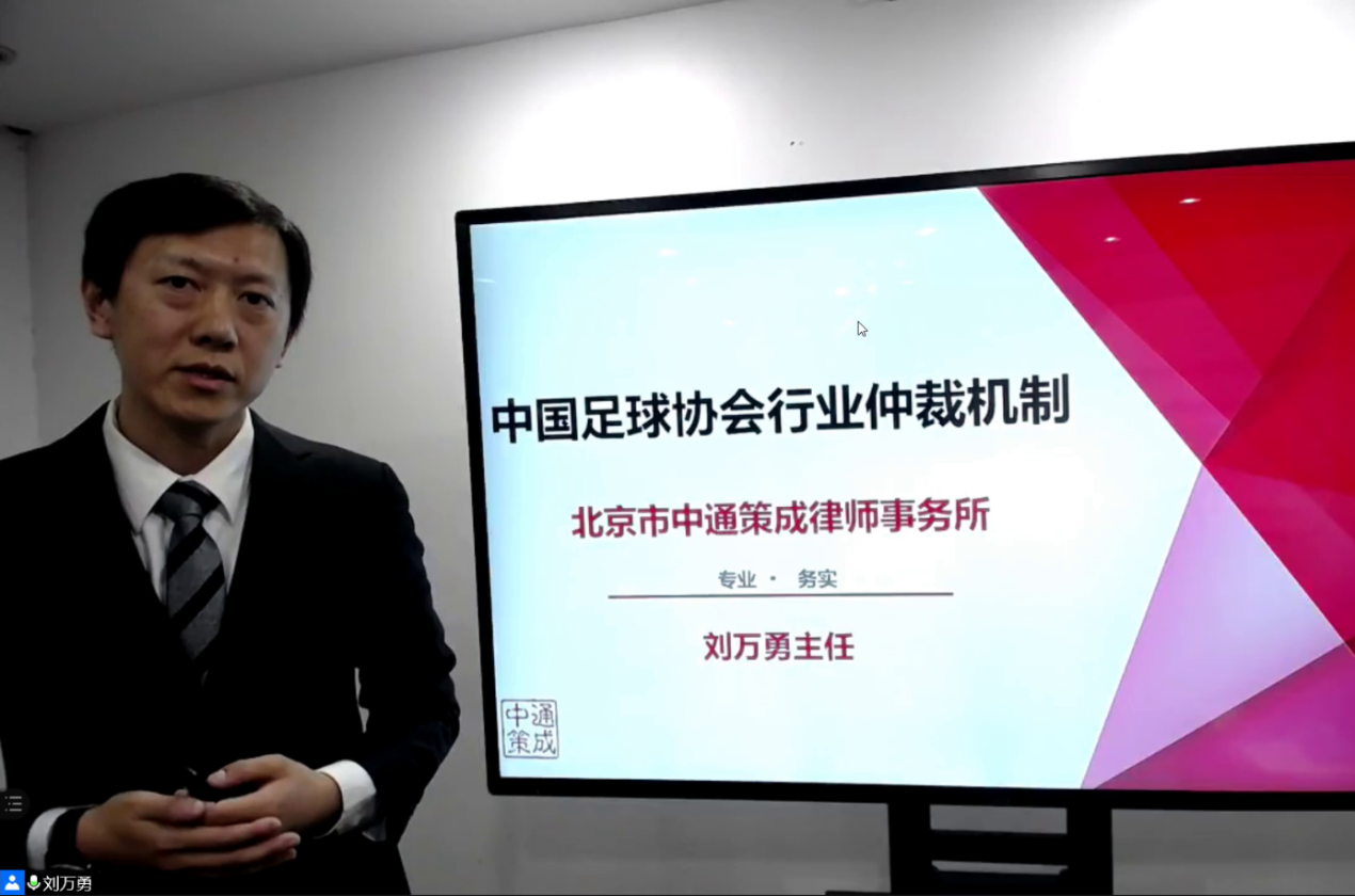 2020年11月3日晚19至21点,由永利集团官网体育法研究所主办的“体育法治与健康中国”论坛第二十期通过腾讯会议的形式在线上举行。本期学术论坛由北京市中通策成律师事务所主任、中国足协仲裁委员会副主任刘万勇律师主讲,主题是“中国足球协会行业仲裁机制”。论坛由马宏俊教授主持,姜涛副教授点评。来自全国各地的体育法同行、体育法律师库部分入库律师以及yl88858永利官网体育法硕士研究生参加了本次论坛。