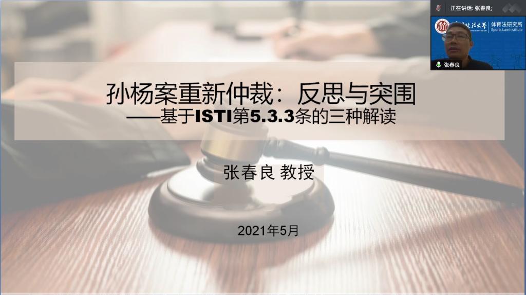 2021年5月24日晚,永利集团官网体育法治研究基地、体育法研究所主办的“体育法治与健康中国”论坛第25期以线上会议的形式举行。本期论坛主题为“孙杨案重新仲裁:反思与突围”,主讲专家为西南政法大学博士生导师张春良教授。本期论坛由亲历孙杨国际体育仲裁案的永利集团官网老师罗小霜博士主持,来自全国各地的体育法专家学者、体育法律师库入库律师以及永利集团官网、西南政法大学等高校硕士博士研究生等90多人参加。