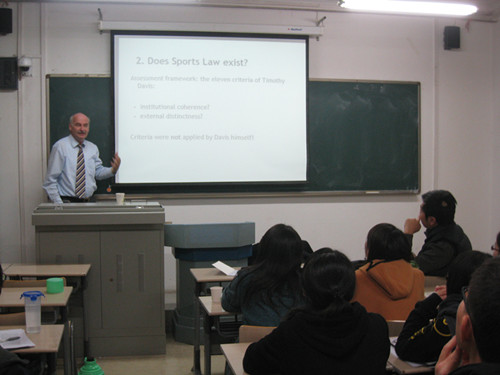 2012年11月8日,应公司体育法研究中心的邀请,鹿特丹大学教授、前荷兰阿瑟世界国际体育法研究中心主任罗伯特•西克曼教授来到公司,为公司体育法专业研究生授课。罗伯特教授在体育法学研究领域有着很深的造诣,他的研究方向和学术成果处于体育法学研究的最前沿。在课堂上,罗伯特教授将理论与实际案例相结合,重点讲授了足球运动中的体育法学知识,并与员工进行了热烈的学术研讨。课后,听课同学表示罗伯特教授的授课内容让大家受益匪浅,开阔了大家的学术视野,促进了对世界体育法的了解。