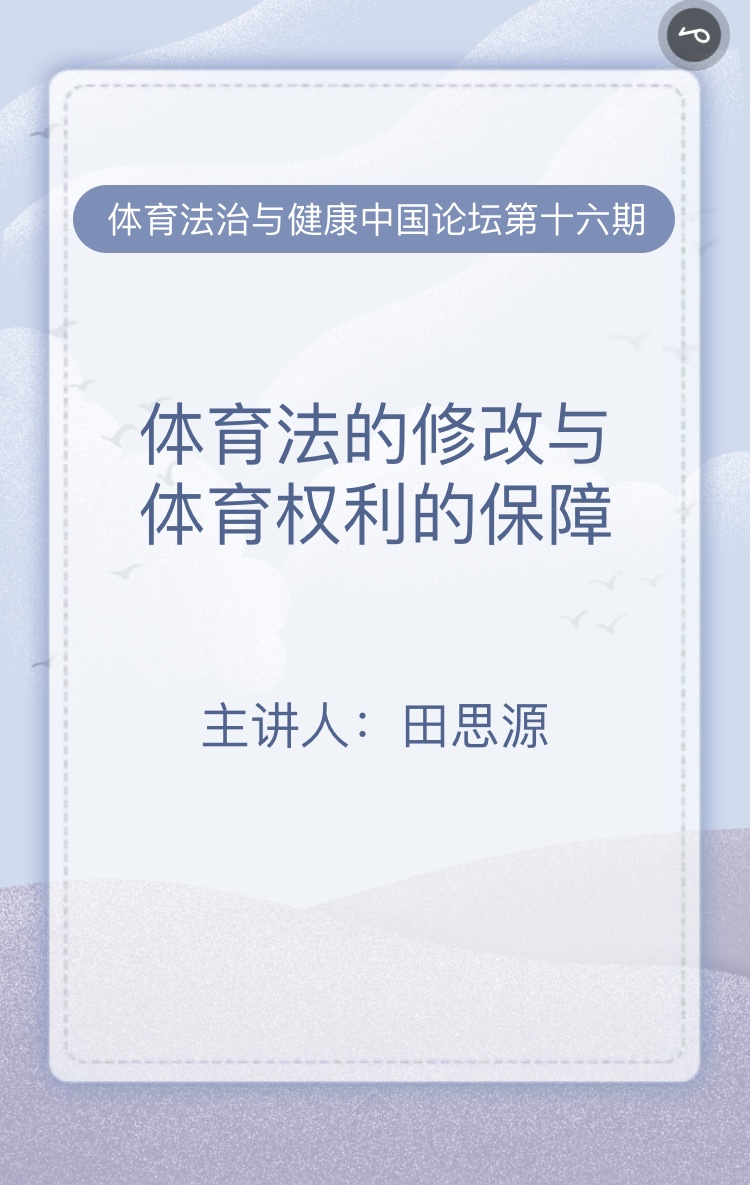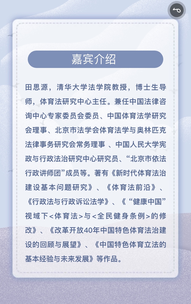 2020年5月6日晚,“体育法治与健康中国”论坛第16期通过腾讯会议的形式在线上举行。本期学术论坛邀请了清华大学yl88858永利官网体育法研究中心主任、博士生导师田思源教授主讲,主题是“《体育法》的修改与体育权利的保障—体育权利的展开”。讲座由张笑世教授主持,袁钢教授评议。