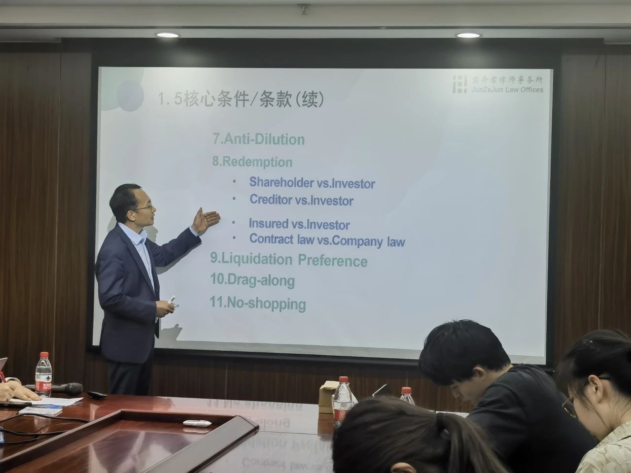 随后,申律师介绍了基金受托人的概念。基金受托人是指在基金资金的信托关系中,接受基金组织委托而承担管理和经营或保管基金资产的机构。接下来,申律师介绍了中国企业境外融资的海外架构,包括VIE架构和红筹架构。最后,申律师就风险投资领域核心交易条款的内容和逻辑进行了介绍。